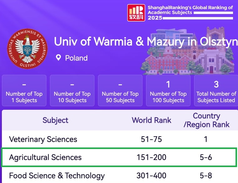 Po raz kolejny nauki rolnicze na UWM znalazły się w dziedzinowym Rankingu Szanghajskim (Global Ranking of Academic Subjects)