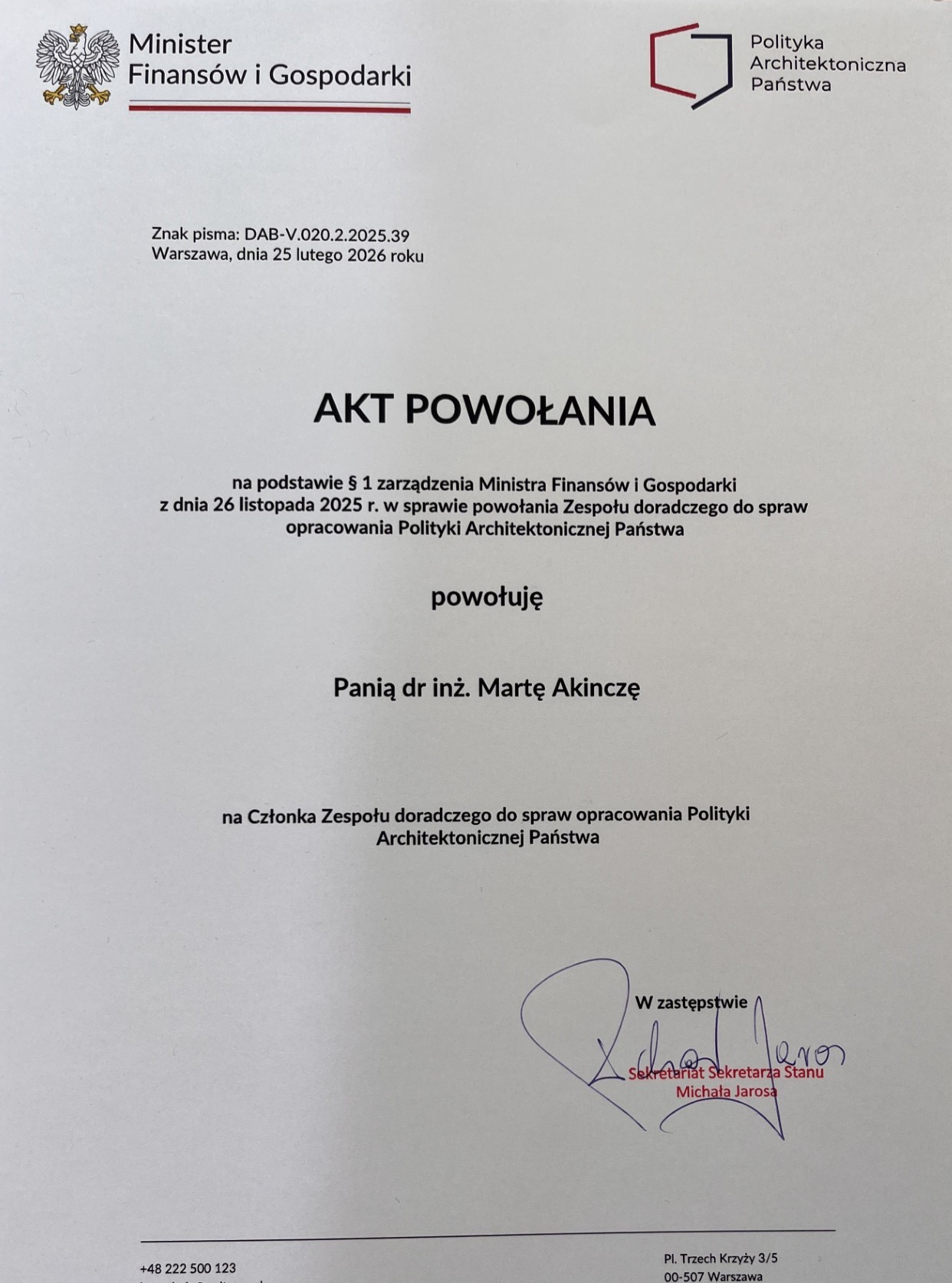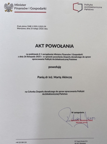 Miło nam jest się pochwalić, iż w dniu 11 marca 2026 r. n- dr inż. Marta Akincza @martaakincza została włączona do zespołu ds. opracowania Polityki Architektonicznej Państwa, powołanego z inicjatywy Ministerstwa Rozwoju i Technologii.